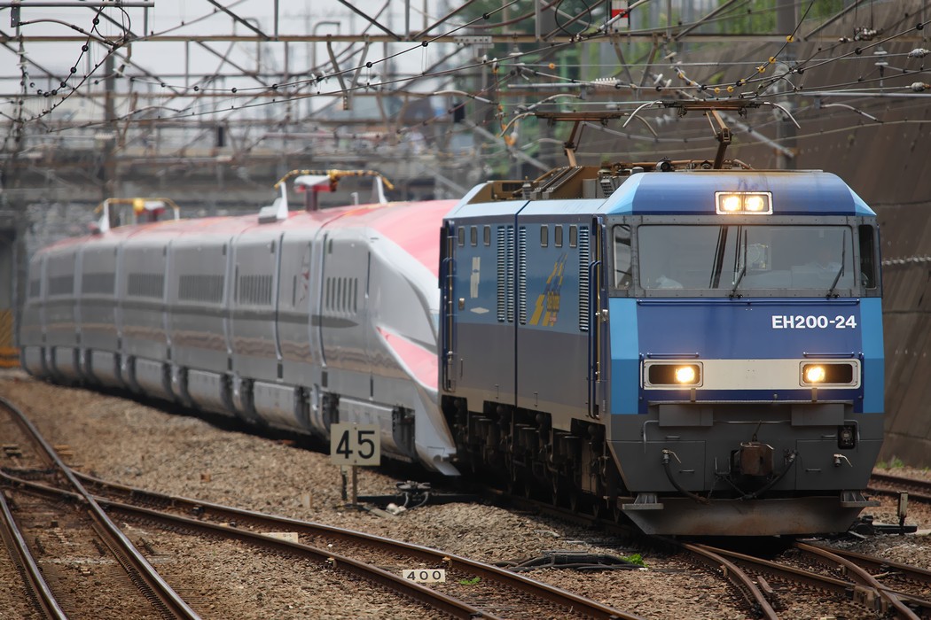 撮影地に到着は約10分前。新秋津にて EH200-24 がけん引する仮台車を履いたE6系Z13編成。秋田行きの甲種輸送、9781レです。前回の輸送では北府中で直前にトラブルがあったとかで、この日、一部の駅ではロープを張って区切るなど対策をとった駅もあるようです。