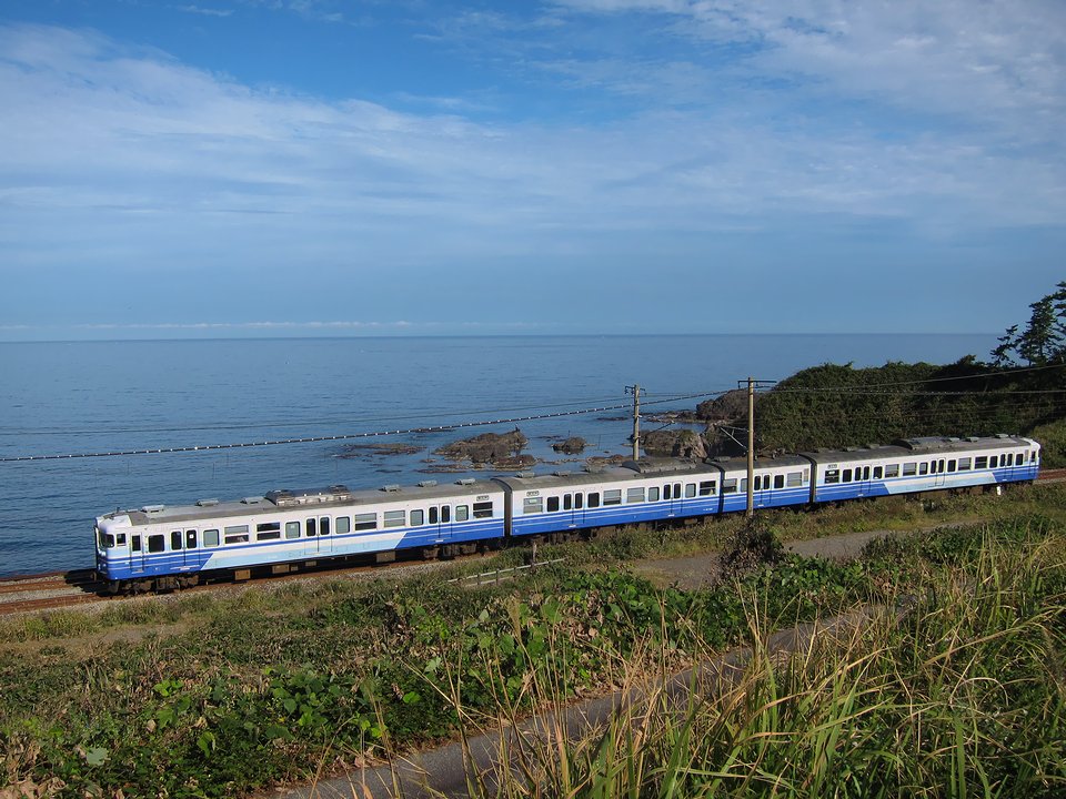 こちらはノーマルな新潟支社115系の青い編成。1330M 直江津行きです。空の青と海の青と車体の青がきれいに写し込めるのですが、下草が多いのが難点。