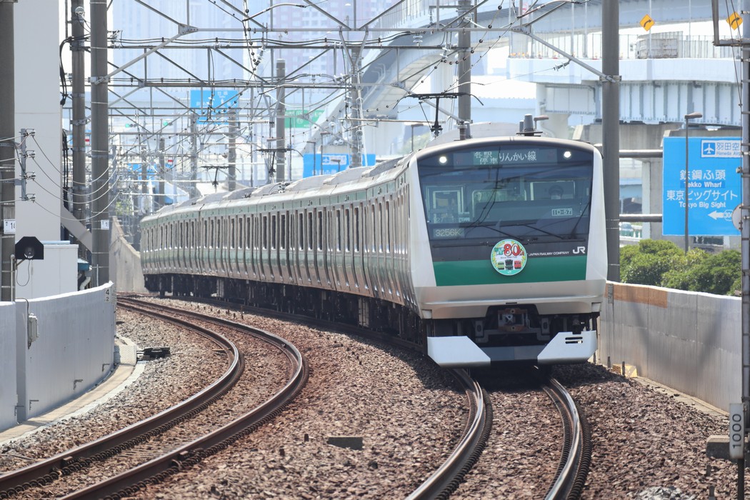 新鶴見信を発車するクラE235系。列車番号は9832M の折り返しなので順当に「9833M」表示です。